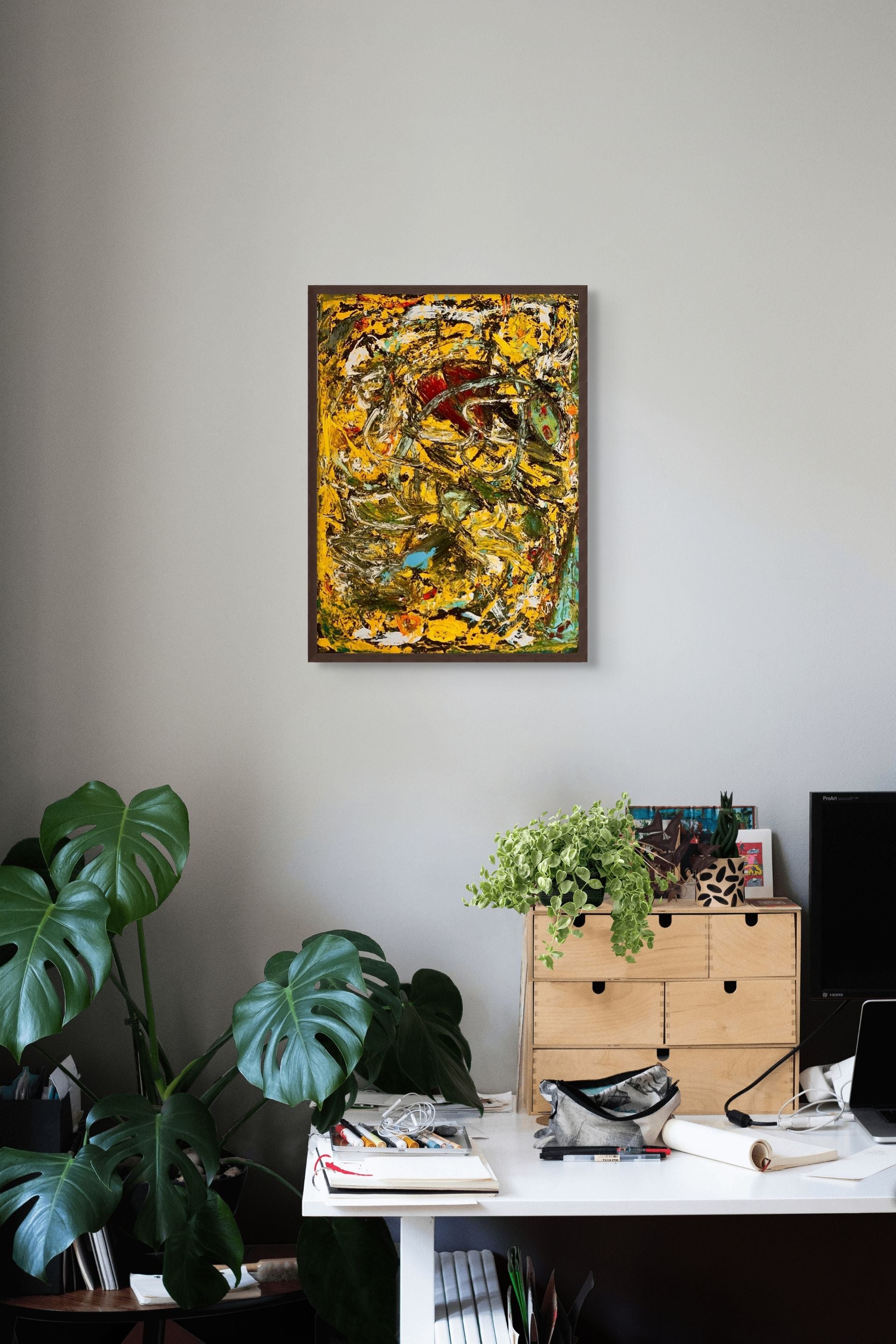 Energetic and tactile mark-making creates a sense of movement, collision, and emotional urgency.